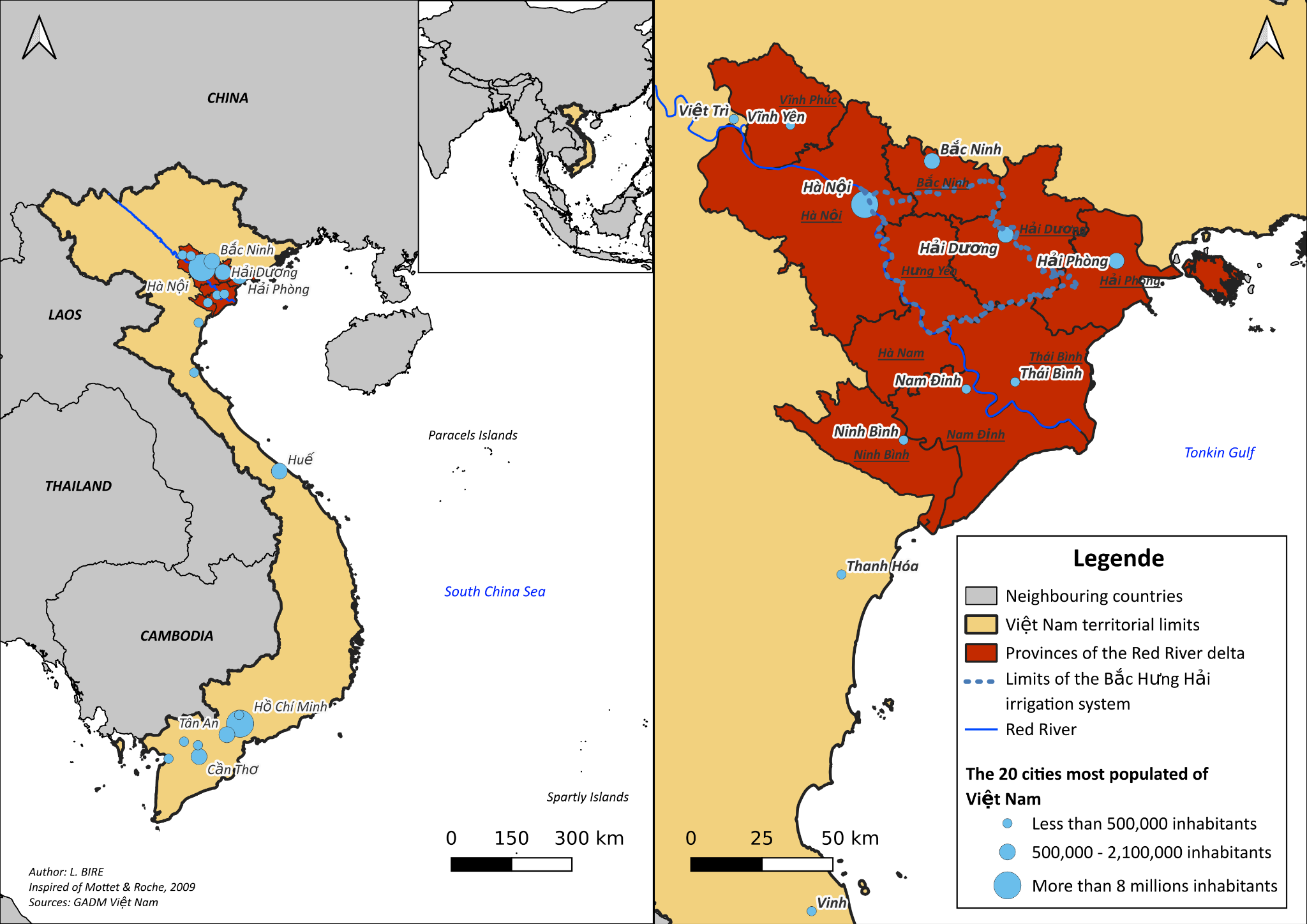 The idea that water is a common good was not widely accepted until the second half of the 20th century. Since then, large irrigation management infrastructures have been undertaken by the states of the southern decolonized countries. In northern Vietnam, along the Red River Delta, major works to install the Bac Hung Hai irrigation system were initiated in 1958 and completed in 1963, covering an area of over 145,000 hectares (Figure 1). Historically built to accommodate rice plots, 80% of its surface is still occupied by rice cultivation today. The irrigation system serves a population of 3 million, people of which 2.2 million are engaged in agriculture and aquaculture (General statistics office of Vietnam 2021). Since the early 2010s, the agricultural sector has seen a trend toward diversification: a growing share of farms are being forced to convert activities, particularly to livestock and market gardening, due to the many challenges facing the irrigation system (Fanchette 2014). Thanks to wastewater treatment plants, Bac Hung Hai also provides clean water for domestic use as well as for industries for the entire irrigation system.