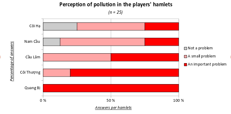 Players gave their perception on the importance of pollution as an issue in their hamlet, just before initiating the game, in a questionnaire (Figure 10). In the same village, pollution can be perceived as an important problem by some farmers and a small one by others. Hamlets Cau Lam, Coi Ha, Coi Thuong and Nam Cau all share split answers considering the perception of importance of pollution. However, participants from the village of Quang Bi all shared the opinion that pollution could be considered an important issue there. All three villages which consider pollution is actually a problem are all located alongside the Cau Day primary canal, which takes its source directly from the main canal east of the commune. These villages are the first where pollution has an impact, and are where solid waste would linger, while the villages of Coi Ha and Nam Cau, further away from this polluted canal, might be preserved.