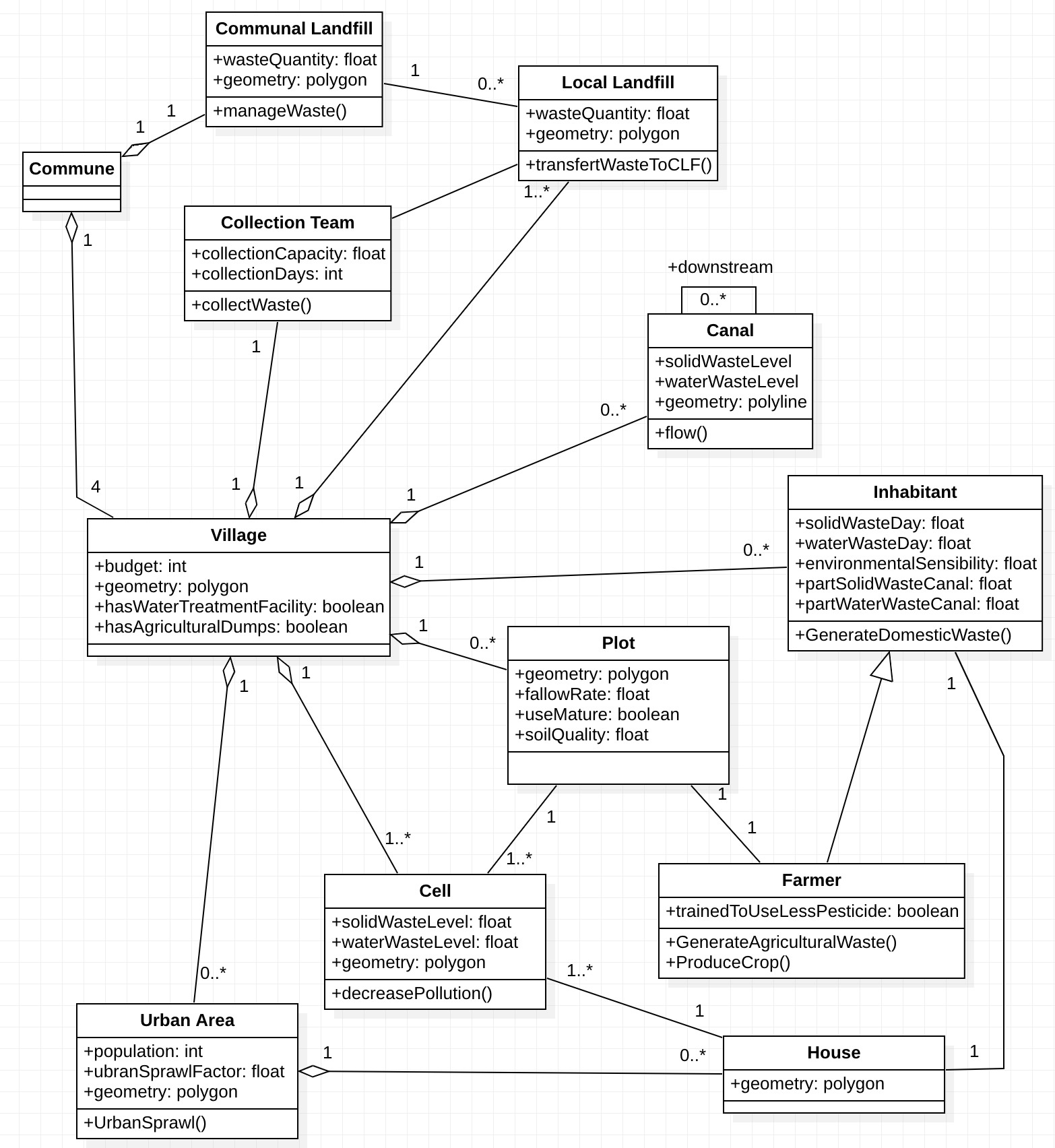 The model includes the following entities: commune, villages, canals, plots, urban areas, houses, farmers, inhabitants, square grid cells, collection teams, local landfills, and a communal landfill. An UML diagram detailing the relationships between these entities and their state variables is provided in the Appendix 2. The Commune agent represents the entire territory, which is subdivided into Village agents where waste management actions are implemented. Each Village comprises Canal agents, representing the irrigation system, and Cell agents, representing the land and acting as waste storage (solid and liquid). Villages include Urban Areas, which are specific agents with geographic extents that can expand (urban sprawl). Urban Areas contain House agents, each housing an Inhabitant agent. Inhabitants produce waste (solid and liquid), some of which is disposed of in the nearest canal or on the land (via Cell agents). Rural areas within villages consist of Plot agents, representing farms with defined geographic boundaries. Each Plot is linked to a Farmer agent, a specialized type of Inhabitant agent. Farmers not only produce domestic waste but are also responsible for agricultural production and waste generated by farming activities. Waste reduction in the system is managed through various processes. Canal agents transport waste along the irrigation network. In each village, Collection Team agents gather solid waste from Urban Areas and transport it to the Local Landfill agent. The Local Landfill then transfers solid waste to the Communal Landfill, which handles waste management at the commune level. Additionally, waste deposited on Cell agents naturally degrades over time.