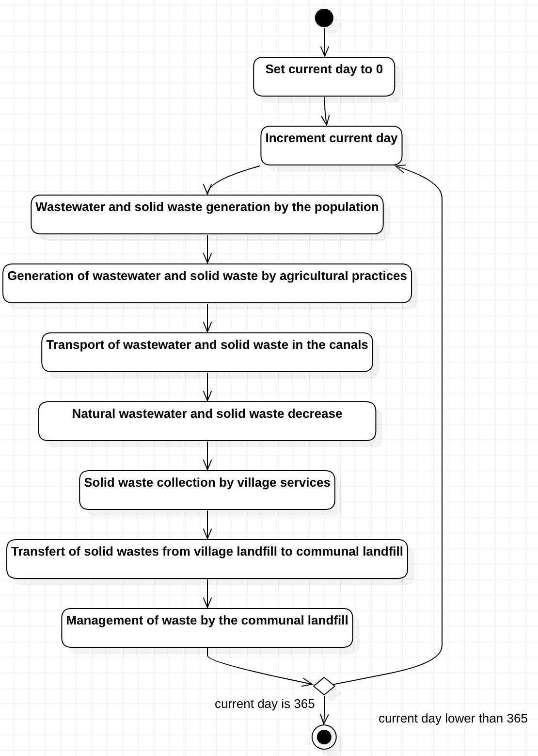 - Waste water and solid waste production by the population: the Inhabitant and Farmer agents trigger their GenerateDomesticWaste action: this action calculates the total water and solid waste production according to the environmental sensitivity of the individuals (for solid waste) and the presence of a water treatment facility for the village (for water waste). Then, part of the waste is dumped directly on the ground and the other part is dumped in the nearest canal.