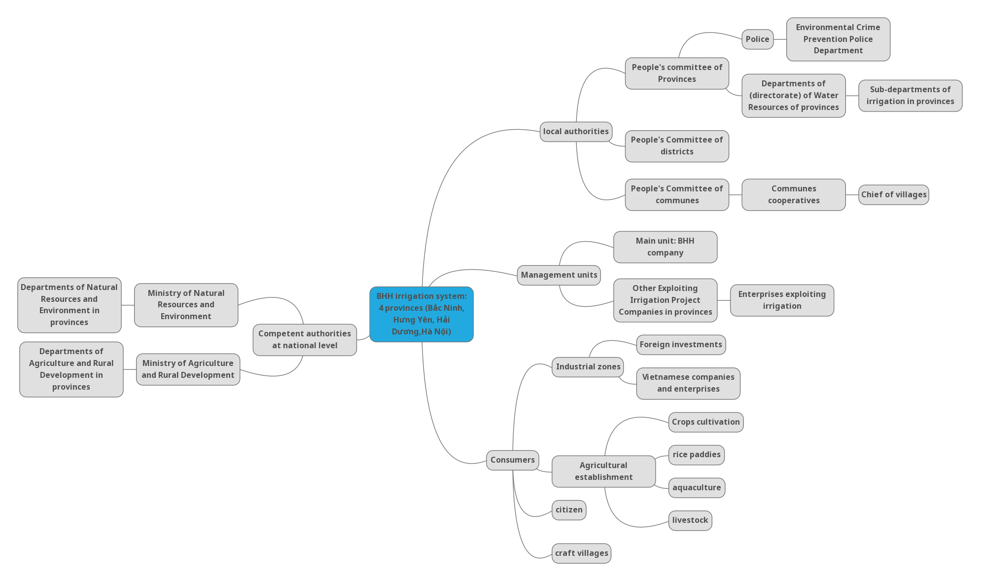 An overview work was first conducted to identify the stakeholders involved in water management in the Bac Hung Hai irrigation system. This step was crucial in order to better define our interview questions for the interview campaign we are presenting in the next paragraph. This first exploration showed the complexity of the stakeholder network, between the State, State driven entities and private entities both managing irrigation water and works, and beneficiaries (Figure 3). This mental map of stakeholders was first built up through online and press research, and then confirmed in the field during the interview campaign.
