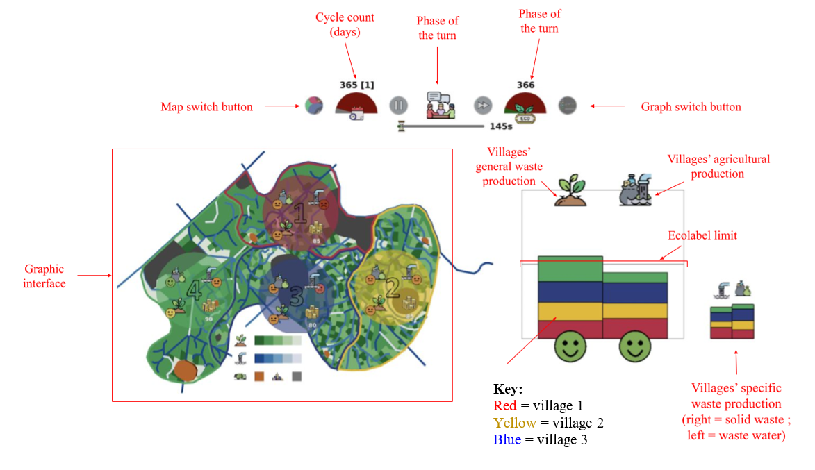 Figure 4 presents the interface of RÁC. This interface was projected on a wall during the game session. In addition to the top-level panel, 2 types of information are displayed on the interface: the map with information concerning each village (left panel) and the global indicator (right panel). The idea of this interface was to be able to easily adapt to the different players: with more detailed information for those who are more comfortable with this type of game, such as charts of the evolution of the different indicators, detailed maps of the yield of each agricultural plot, and at the same time more synthetic information such as the share of pollution and agricultural production contributed by each village and the difference between these values for the commune and the thresholds of the EcoLabel.