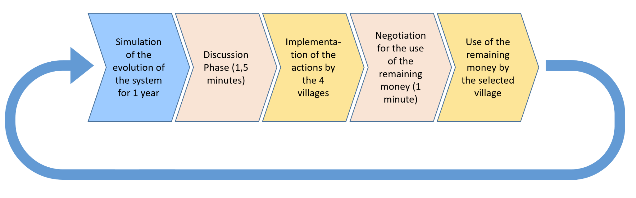 - Phase 2 is when the game takes place. This phase is played in 8 (short game) or 10 (normal game) rounds, and each round lasts approximately 5 minutes. A turn in the game represents a year of operation within the system (the territory of the fictional commune) with which they interact. Each round is divided in two steps: first, the 4 groups choose their actions, communicating or not with the other groups, during 1 minute and 30 seconds. After that, each group scans their QR codes so that the actions they represent are implemented in the model. The remaining money which has not been spent by the players goes into a common pool. Once all the players are done implementing their actions, a new step is triggered in which players can decide to give this common pool to a player to choose an additional action. The time to decide who will benefit from the pool is also limited (1 minute) and if no player is selected on time, the pool is considered lost. Finally, in the last step, the simulation of the model is run and the players can observe the evolution of their territory and discuss the impacts of their actions, both in their village but also in the other villages and at the commune level; then the next round begins.