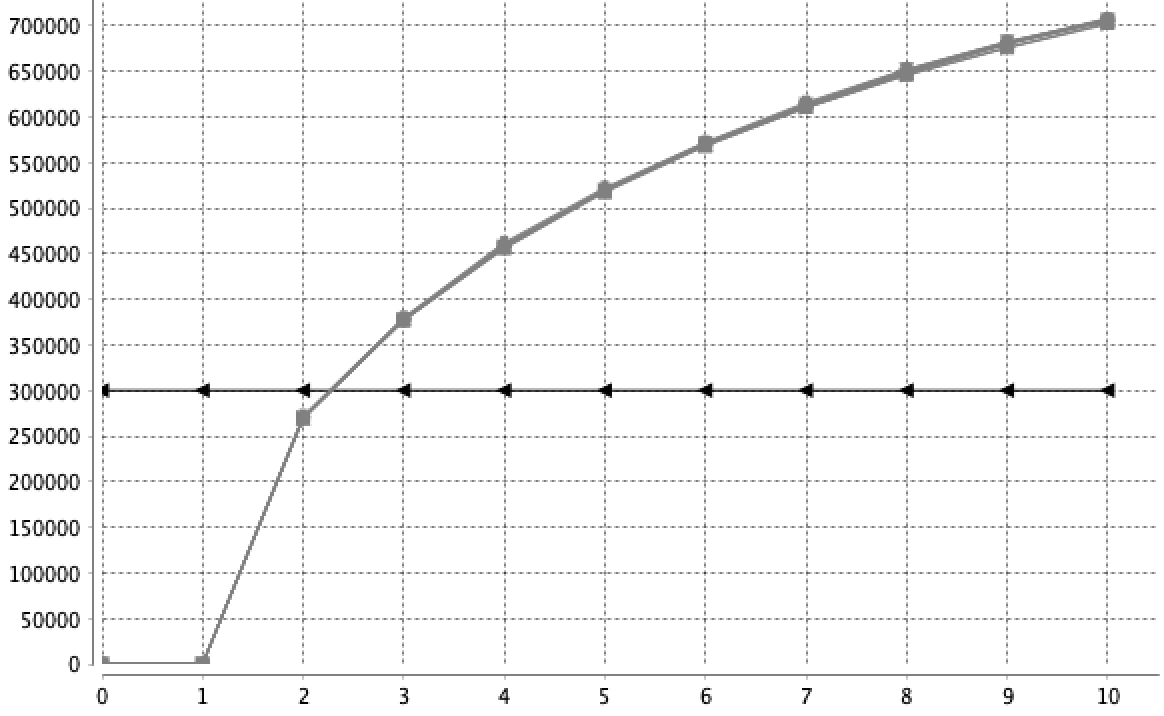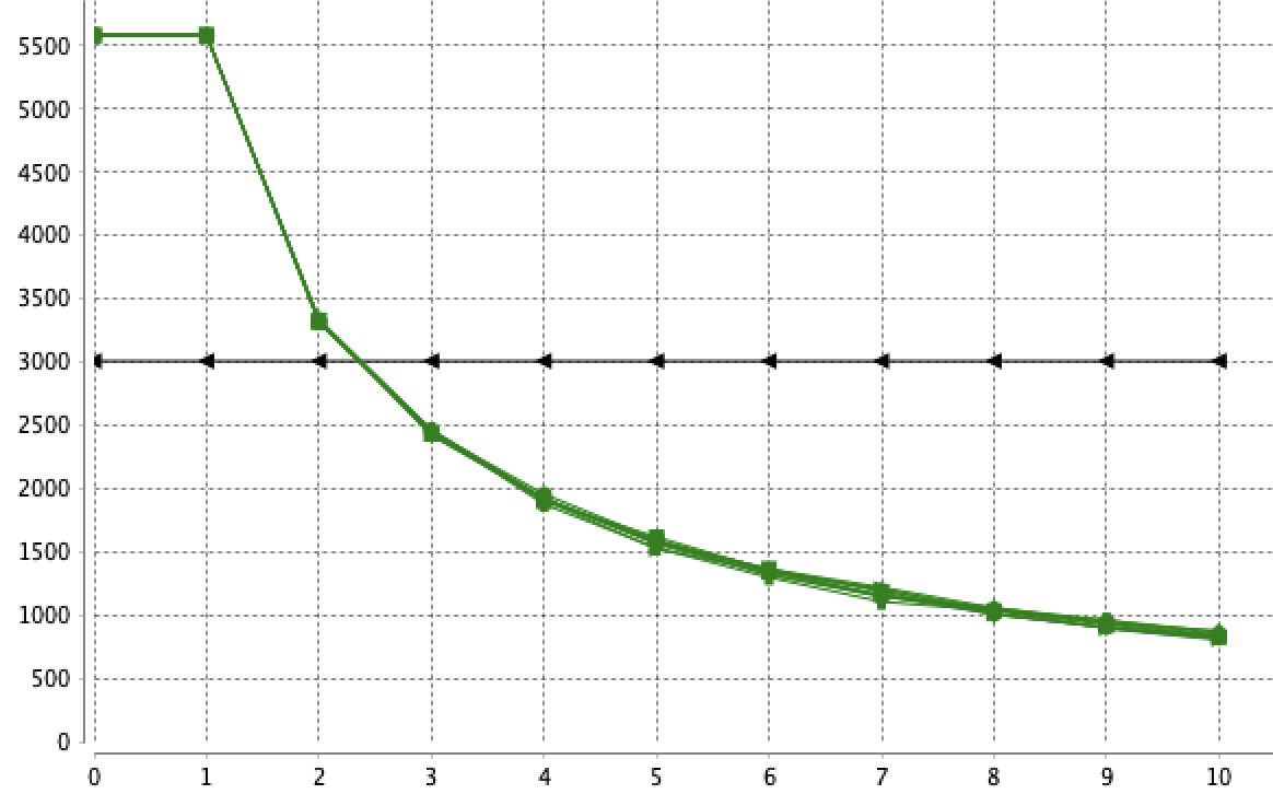 To illustrate the dynamics of the model, we ran 10 simulations with the default parameters (those used for the game) to observe the evolution of pollution (sum of solid and water waste) and agricultural production over 10 replications. Figures 6 and 7 show, respectively, the evolution of pollution and agricultural production over the years and the criteria to be met in order to obtain the EcoLabel (i.e. maximum pollution and minimum production). A first result is that the impact of the stochasticity of the model is very small: the difference between the results obtained for the 10 replications is not significant. Another result is the fact that if no action is taken at the village level, the level of pollution increases rapidly and the level of production decreases rapidly, showing the direct link between agricultural production and pollution. We can also see that the commune will lose its EcoLabel at the beginning of the third year (after two sets of decisions by the actors).