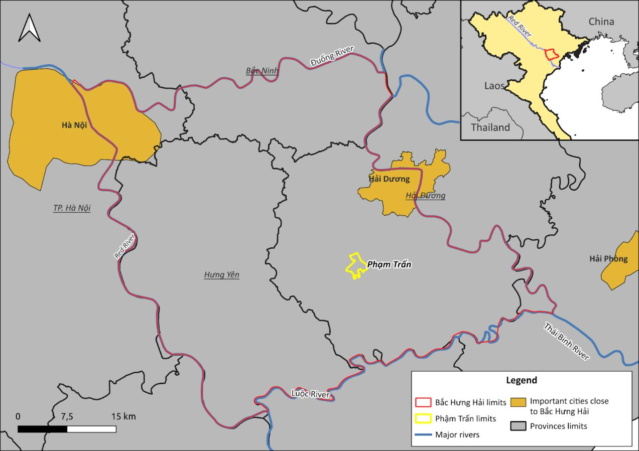 Pham Tran is a rural commune in Gia Loc district, located at the heart of the Bac Hung Hai irrigation system (Figure 8). It counts 5,000 inhabitants who are spread in the form of a grouped habitat, mostly around the major communication axes, for a density of 907 inhabitants per square kilometer. The population is divided between people over 40 and young children, with people between 20 and 30 having often moved to the city (Khué 2019). Apart from village units, the territory of Pham Tran is composed of a mosaic of fields and irrigation channels. Its economy is mainly based on agriculture, mainly rice growing, although the agricultural sector is diversifying. This diversification is primarily due to climatic variability, which makes certain crops more uncertain to grow, such as rice, which requires a constant level of water once sown. In addition, market fluctuations have tended to discourage farmers from maintaining three rice rotations in their crop year as prices have fallen over the past several years. To a lesser extent, Pham Tran has small-scale industries, including a brick factory.