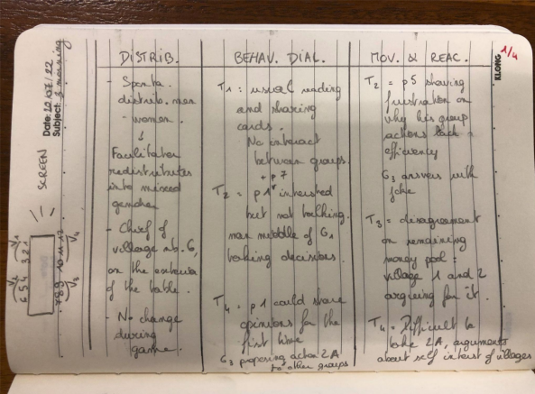 Three main aspects have been identified prior to the unfolding of sessions to guide observations: patterns of players’ distribution inside of groups, players’ behaviors during the game considering dialogue inside and outside groups, movements and reactions of the players during the different phases of the game. In his notebook, the first author would draw three columns and gather observations relying on numbers attributed to players indicated by a drawing of the session (example: p1 means player 1). Observations were divided in turns so that it was easier to recall the unfolding of the game during analysis. On the sheet of paper, T1 means turn 1, T2 means turn 2, etc. One session can comprise several sheets of observations like this.