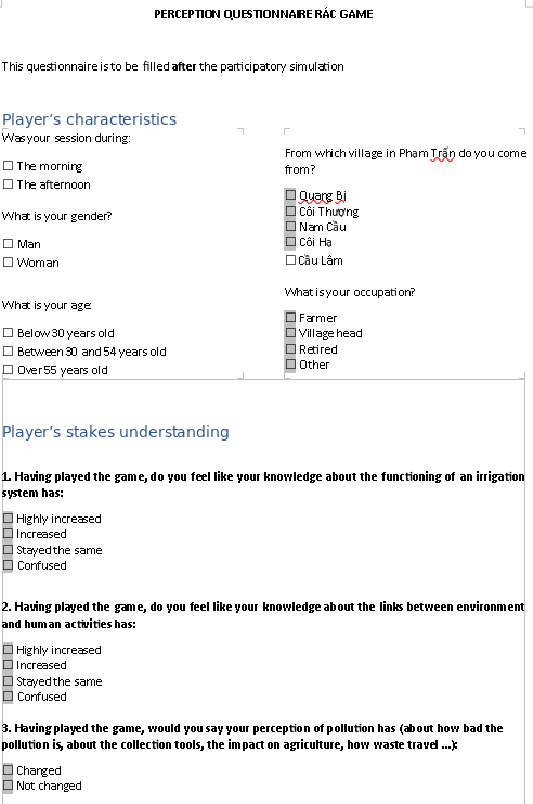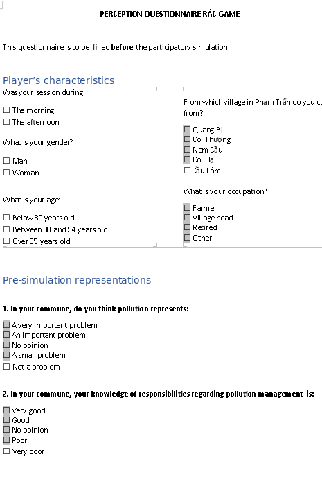Secondly, two sets of questionnaires gathered 64 answers in Pham Tran in total, in the form of two short questionnaires, given to the participants before and after playing (see Appendixes 3a and 3b). Before the game, questions mostly focused on players’ representations on current communication with local authorities considering water and waste management, as well as their views on what they expected of the workshop. After the game, the questionnaires acted as short pre-debriefings since it invited the players to think back on how their session unfolded, as well as their views on sharing opinions about water and waste management and how they evolved (or not) thanks to the game. These questionnaires have been analyzed with simple univariate and multivariate statistics. However, our dataset suffers from a lack of answers from the two first game sessions. Only 49 out of 64 questionnaires have been filled completely. In the results section, the number of answers n will always be given in the title of the graph or along the text.