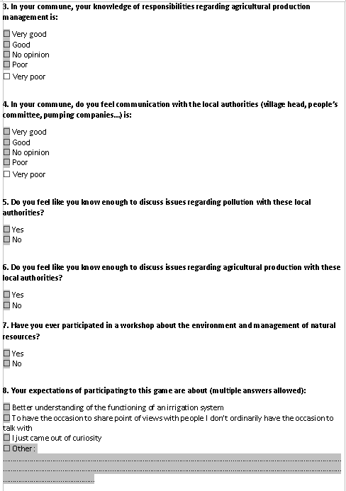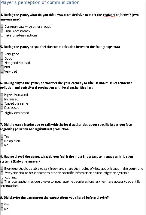 The objectives of the game workshop were not clearly communicated to the players before they were invited. They only knew that they would be taking part in a workshop on pollution management in irrigation canals. Questionnaires distributed after the game showed that the participants associated RÁC as a good tool for awareness and general understanding of the functioning of the irrigation system, which is different from the objective we stated as a research team, i.e. to promote social dialogue and sharing of points of view.