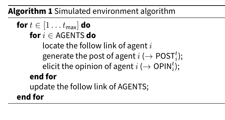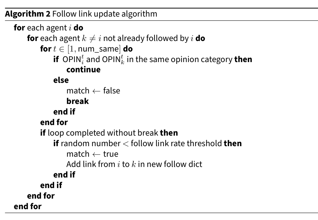 At any given time\(t\), \(\text{POST}^t_i\) fully determines the agent \(i\)’s opinion \(\text{OPIN}^t_i\). The network of follow links between agents is then dynamically updated in response to these evolving \(\text{OPIN}^{t+1}\).