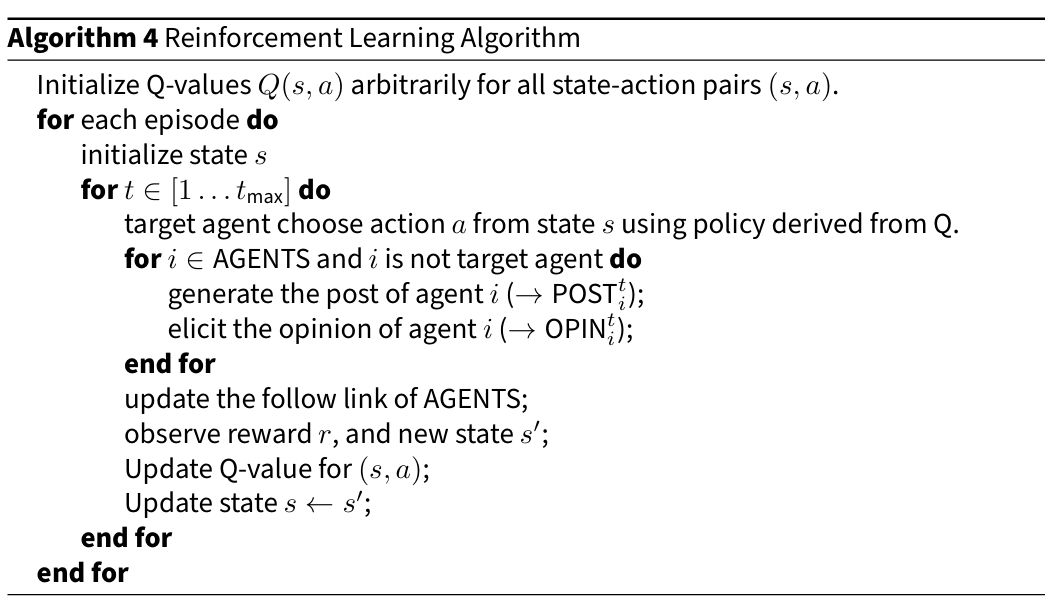 Referencing Algorithm 4, the process begins with the initialization of Q-values for all state-action pairs. In each episode, the state is initialized, and the agent embarks on a series of time steps. During each time step, the target agent selects an action from its current state, based on a policy derived from the Q-values. Alongside each agent in the system generates posts and forms opinions. The algorithm then updates the follow links among agents and processes the resulting reward (followers) and new state. This leads to an update in the Q-value for the chosen action, and the agent’s state is updated accordingly. The Q-value update is represented by the formula: