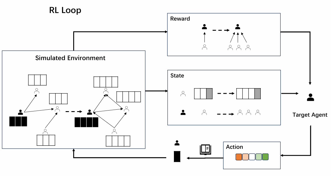 The RL Loop structure is shown in Figure 2. The target agent interacts with the previous introduced simulated environment. At each time step, the agent observes the state of the environment, selects an action, receives a reward from the environment, leading to a new environmental state.
