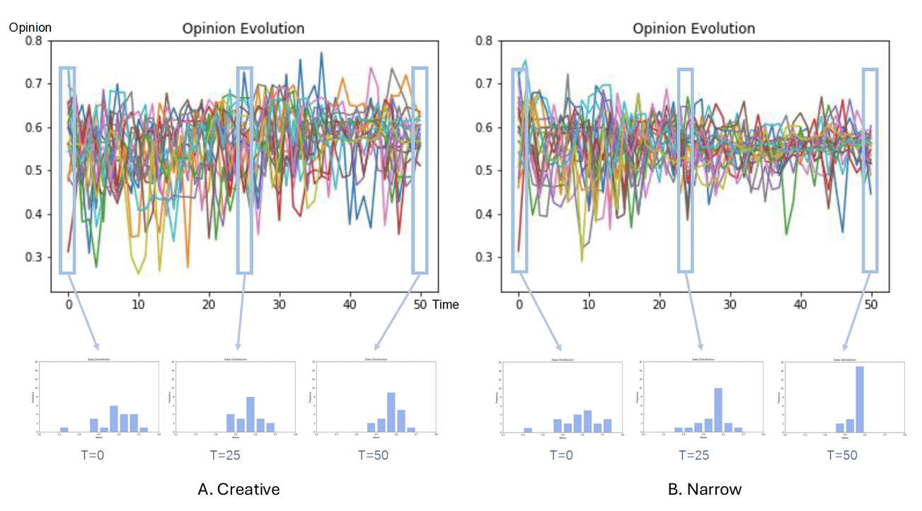 Opinion evolution visualizations show the trajectory of opinion polarity score for 20 agents over 50 steps on Narrow setting and Creative Setting. Initially, the agents’ opinions range from 0.3 to 0.8. In the Narrow setting, we observe that opinion density increases over time, showing a tendency toward opinion convergence. Conversely, in the Creative setting, the opinion density remains more dispersed and chaotic throughout the entire time scale, with less apparent convergence.