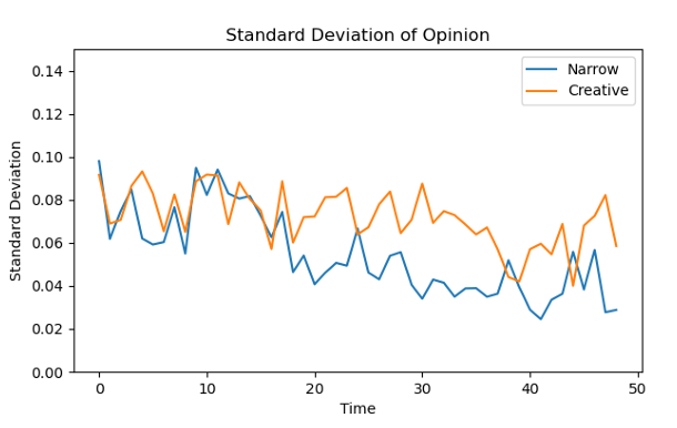 Figure 5 plots the standard deviation of opinion over time in both Narrow and Creative settings. The graph shows that in the Narrow setting, the opinions form a more centralized distribution by step 50, indicating stronger clustering and a more definitive convergence of opinions, as compared to the Creative setting, which remains more dispersed throughout the simulation.