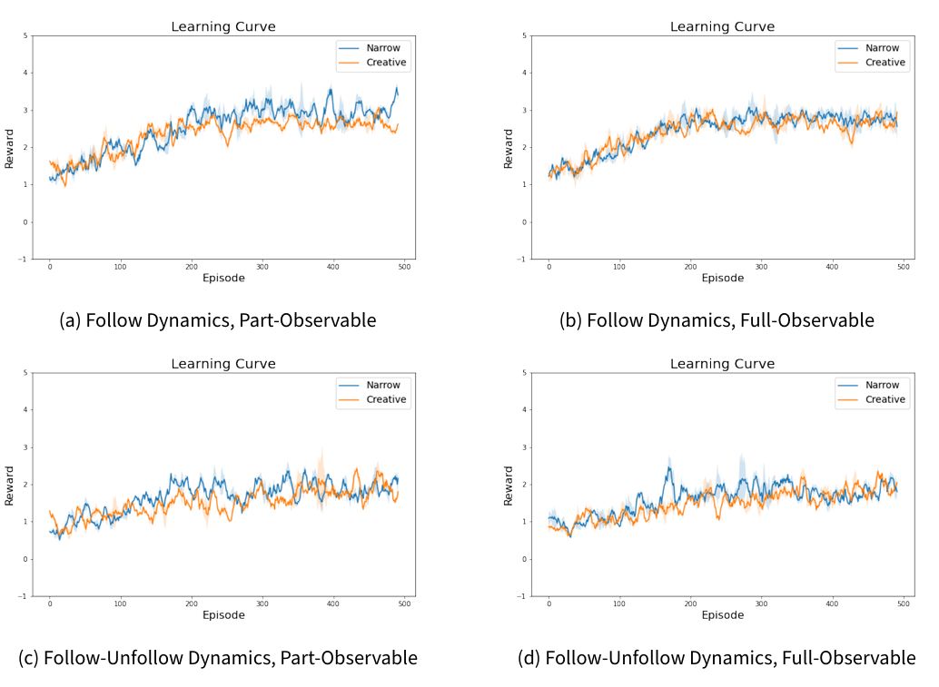 In summary, these results highlight the impact of observability and complexity in reinforcement learning environments, with Full-Observable settings and simpler dynamics facilitating more stable and efficient learning outcomes. The Narrow setting’s predictable nature resulted in higher performance than the unpredictable Creative setting. However, when observability was not a constraint, as in the Full-Observable scenarios, both settings showed similar performance. This suggests that with full visibility, agents can effectively adapt to even unpredictable dynamics.