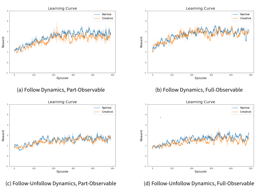 The Narrow and Creative settings, when applied to the Partially-Observable cases, presented distinct learning curves. The Narrow setting consistently outperformed the Creative setting, as evidenced by higher reward values. However, in the Full-Observable scenarios, the learning curves for both Narrow and Creative settings align closely. A possible explanation is that, in Part-Observable scenarios, the unpredictable nature of agents in the Creative setting, leading to lower performance compared to the Narrow setting. Conversely, in Full-Observable scenarios, the agents are better able to adapt to and anticipate the Creative setting’s variable patterns.