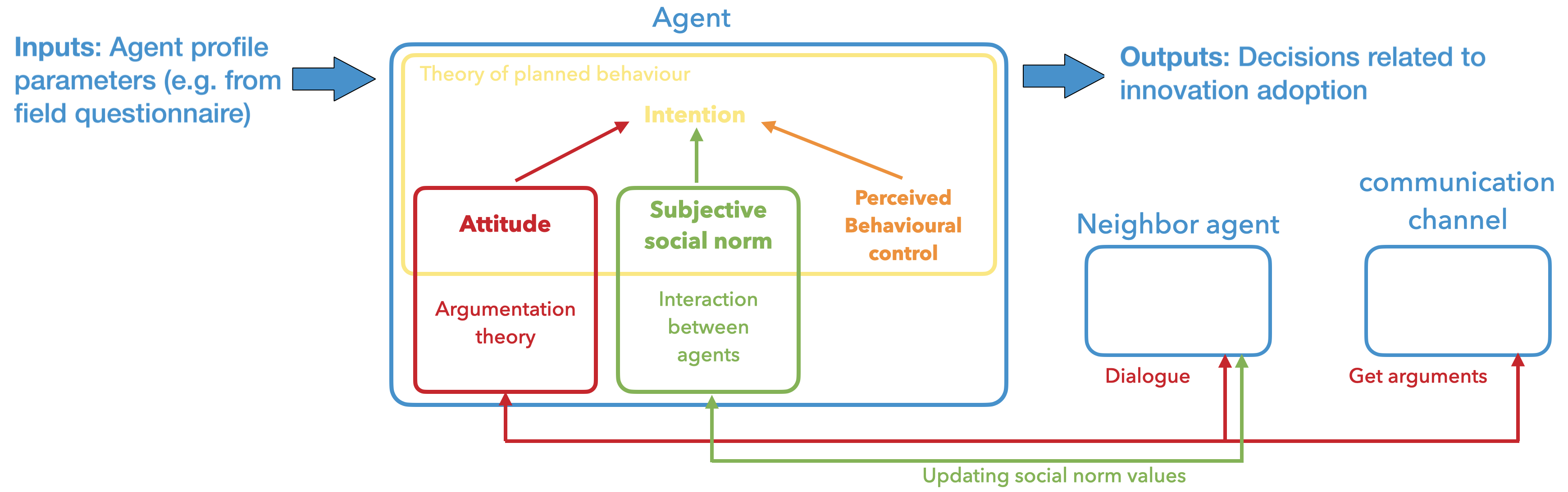 Each time an Individual agent interacts with another agent or a media source, or forgets an argument, it updates its intention to adopt. The intention calculation, based on Equation 1, directly depends on the agent’s attitude, social norm, and perceived behavioral control (PBC). The attitude is derived from the arguments the agent knows, using the Weighted Max-Based Acceptability Semantics (Amgoud et al. 2017). The social norm evolves over time as the agent interacts with others, gradually aligning with that of the interacting agent. The PBC, which is application-specific, lacks a generic definition and must be tailored for each innovation implementation.