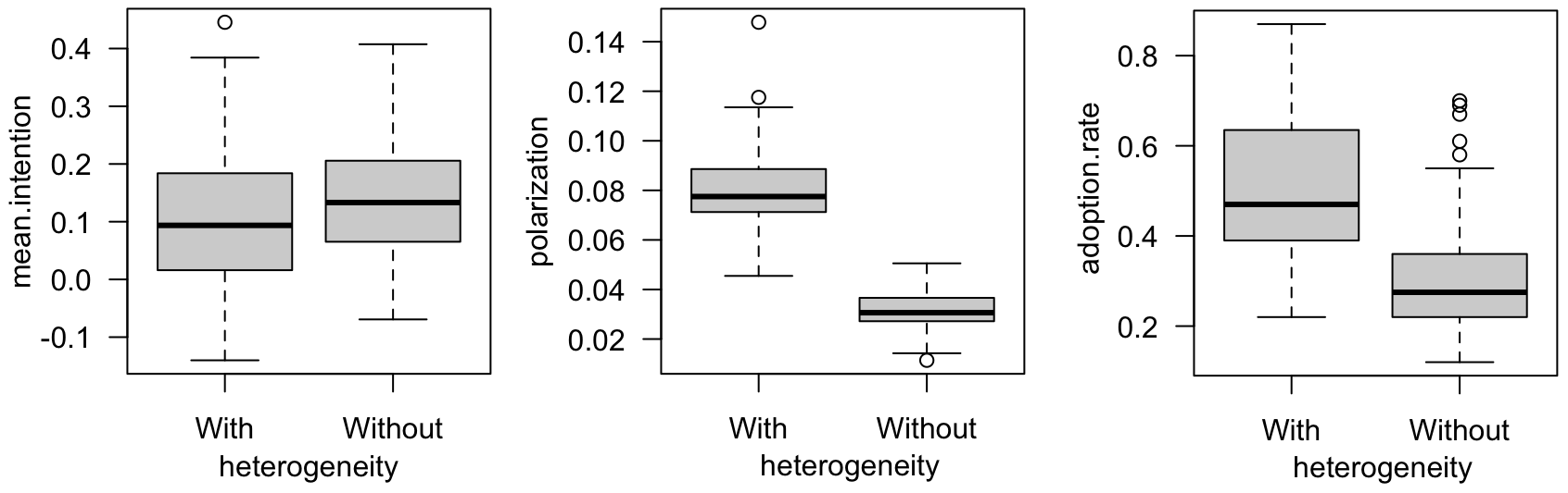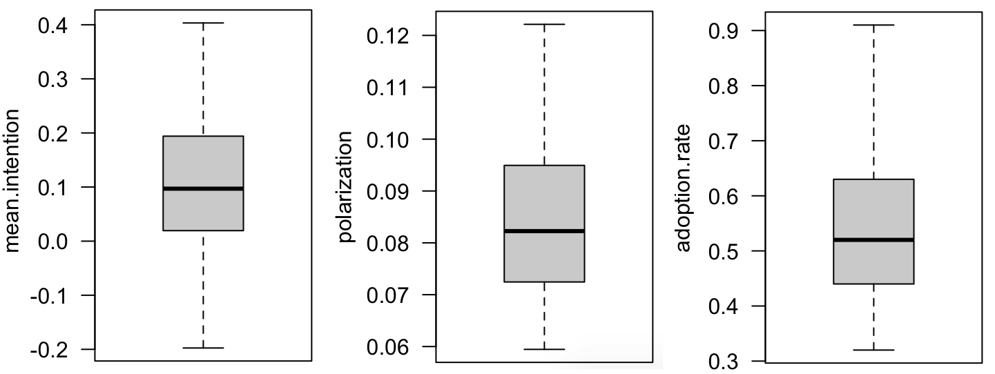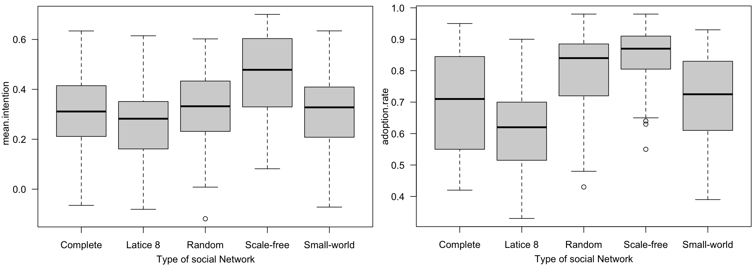 Figure 15 shows for 100 replications and 1000 time steps, the mean intention, and the rate of adopters for the different types of social network.
