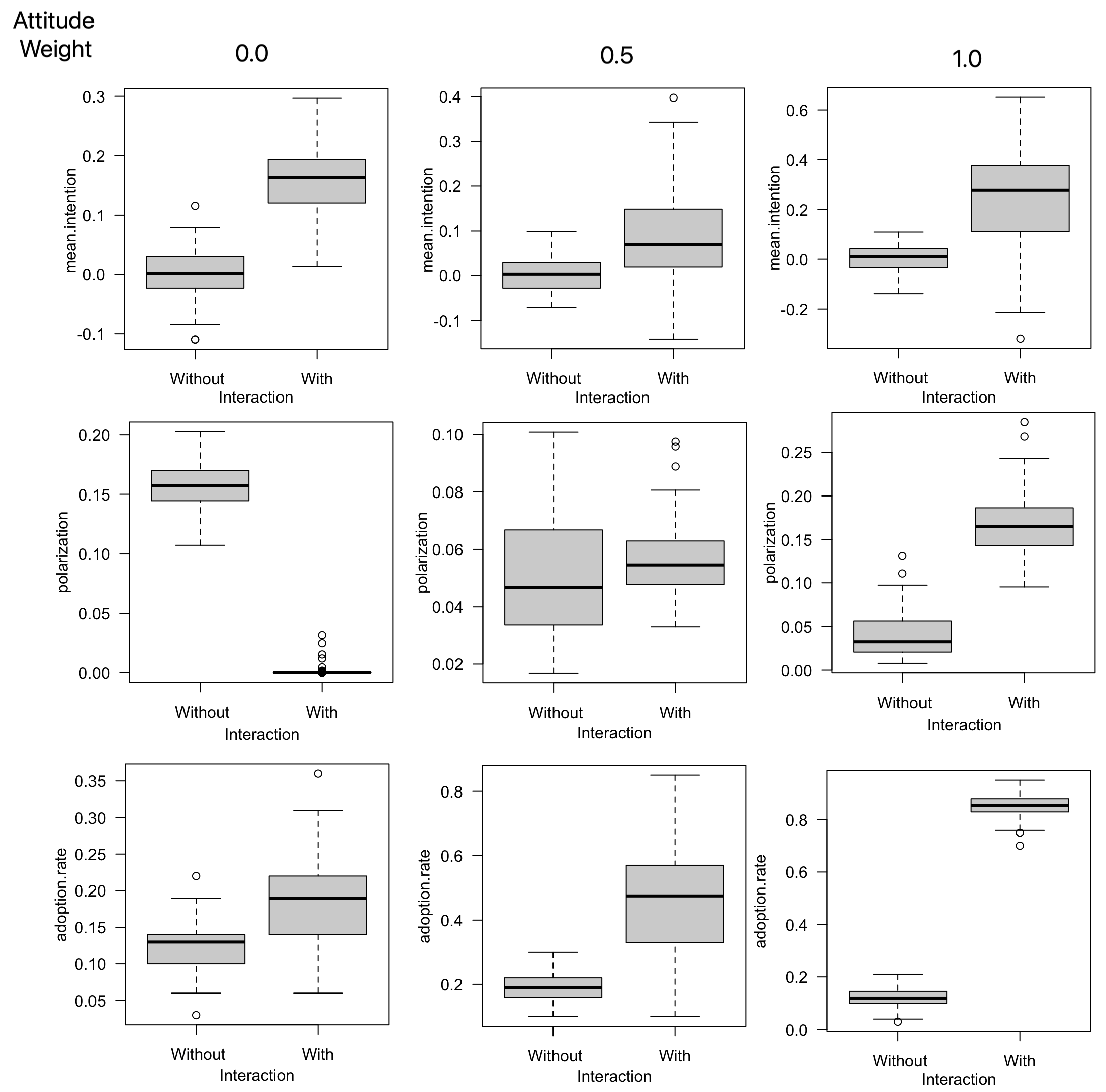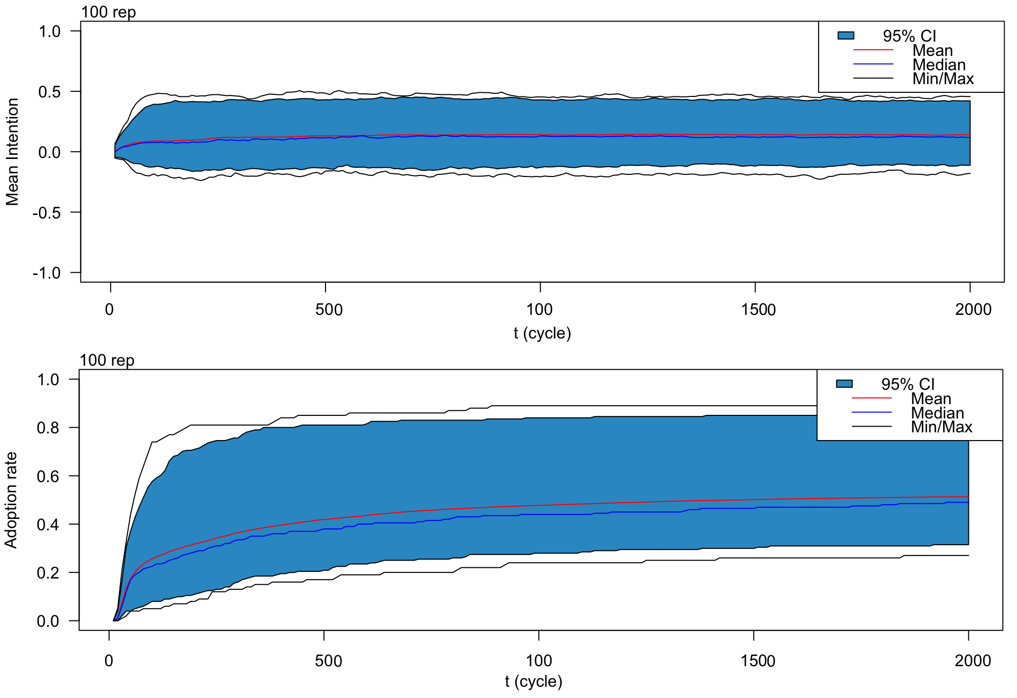 Observation. The key metric observed is the adoption rate (agents in the ‘Implementation’ or ‘Confirmation’ states), which includes both the rate of new adopters over a given period and the cumulative adoption rate. Additionally, the Individual agents’ intentions to adopt is of particular interest. Furthermore, we observe the final polarization of the agents’ intention.