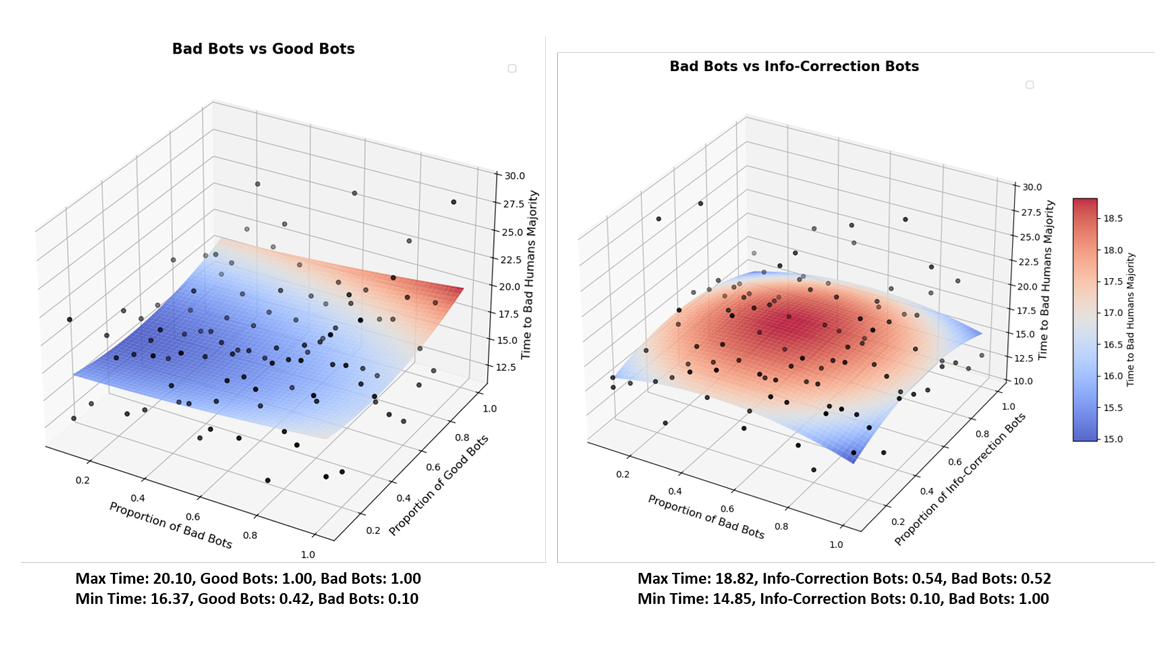 The primary purpose of BotSim is to investigate the conditions under which useful bots can effectively counteract the formation of conspiratorial societies. These useful bots perform actions of information correction and positive messaging. This leads us to the main research question: Can automated useful bots prevent the formation of conspiratorial societies where Bad Bots are present? Empirically, we define a conspiracy society when all the Human Agents in the simulation have turned to Bad Humans. In our investigation of this question, we analyzed the optimal deployment ratios between Bad Bots and useful bots to maximize intervention effectiveness, and how the two types of useful bots (Info-Correction versus Good Bots) compare in their resource efficiency.