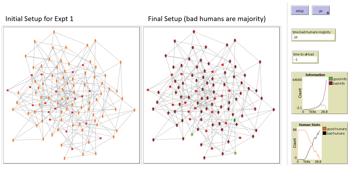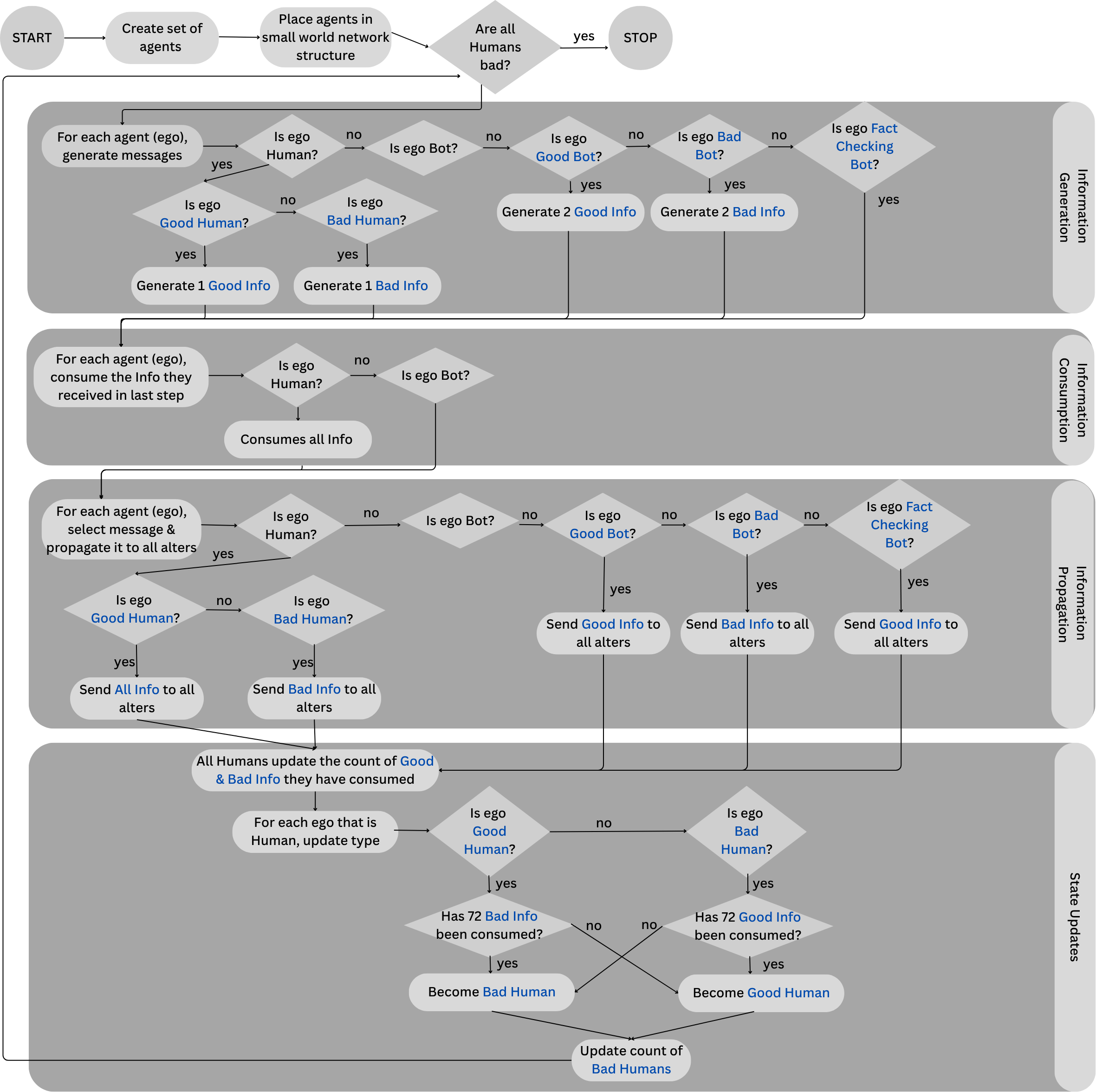- The final stage in this cycle checks the conditions of the network, which tracks information consumption metrics by doing a count of good/bad information consumed per Human agent, and monitors the outcome measures to determine if the simulation should be terminated. The simulation terminates either when all Human agents turn into Bad Humans, or is stopped at 100 time ticks.