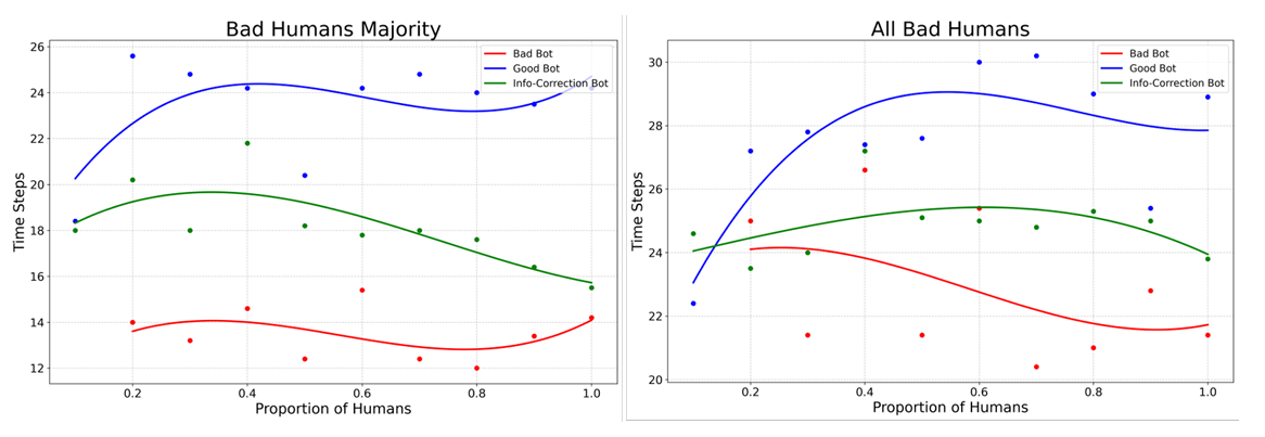 Lastly, this project tested only two types of bots: Good Bots and Info-Correction Bots. In reality, there are a suite of social bots that could intervene the online space and possibly prevent conspiratorial society from forming (Gorwa & Guilbeault 2020; Ng & Carley 2025b). Future research includes increasing the generalizability and robustness of our conclusions through testing a wider range of agent types.