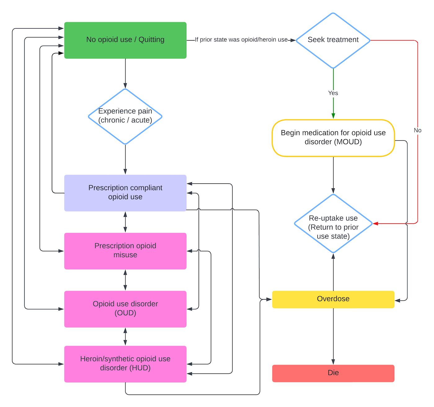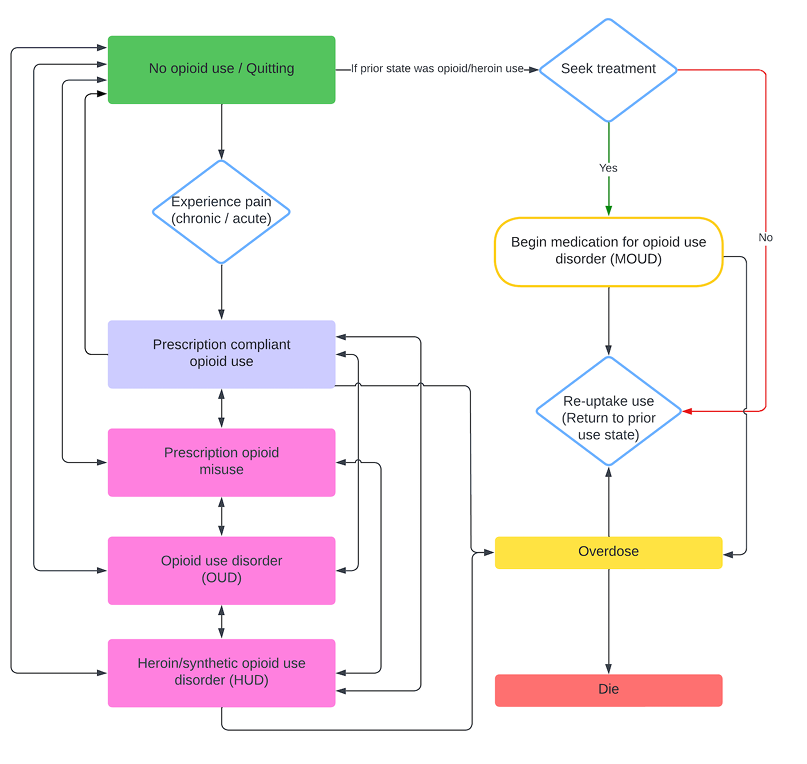The model tracks initiation of opioid use through prescribed medications including the use of prescription opioids for chronic or acute pain, and transitions from other substances to opioids or through other exposure to illicit opioids. The model includes illicit drugs heroin/fentanyl, and medications for opioid use disorder (MOUD) including buprenorphine. Agent interactions include dealer-user relationships; accessing prescription opioids (POs) through emergency departments, pharmacies, and other healthcare settings; and user-peer networks.