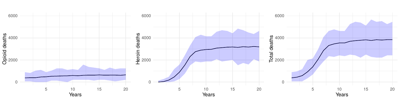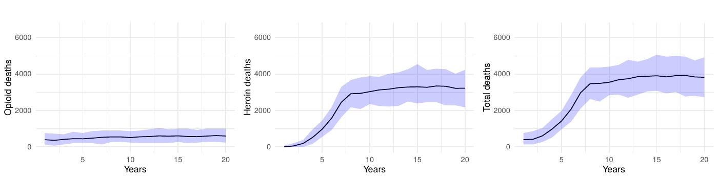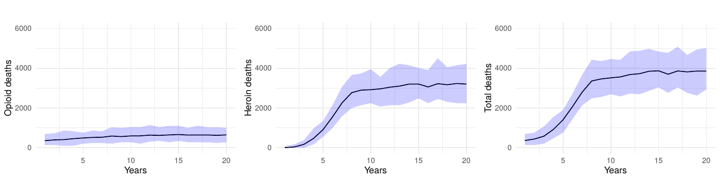 Upon the application of interventions, we observed an eventual—sometimes notable—decrease in deaths. The intervention scenarios simulating complete interruption strategies yielded a marked decrease in fatalities, underscoring high potential efficacy of such measures. Even partial reduction strategies, targeting a 50% decrease in transition to heroin-use disorder, delivered a significant impact, validating the model’s sensitivity to intervention scale. However, we often observed a significant delay between the introduction of an intervention, even in the ideal-effectiveness scenario, and a strong reduction in mortality.