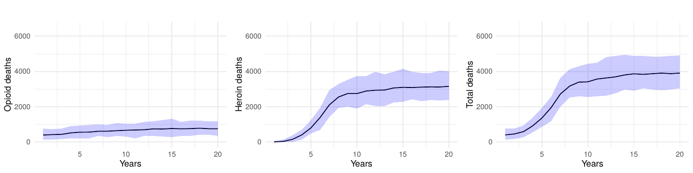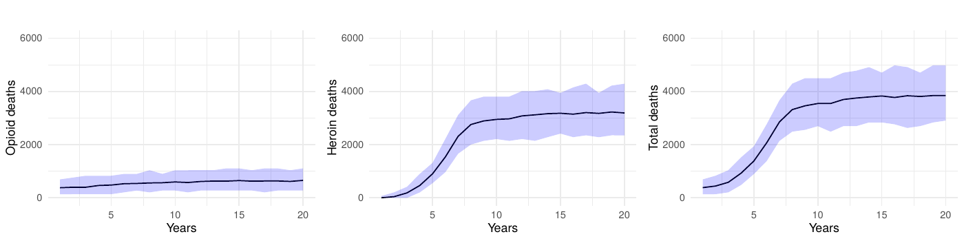 However, modeling each specific intervention or bundle of interventions in all of its policy and contextual nuances can become both unmanageable and quickly outdated, given the evolving nature of opioid-related interventions. Consequently, we opted for a consolidated approach that models generic reductions in transition rates to heroin/synthetic opioid use disorder. By using 50% and 100% reductions, we can capture a range of possible intervention outcomes—from partially to fully effective policies—without tying our analysis to a single policy measure. This approach ensures that our findings remain broadly relevant to a variety of present-day and future prevention strategies, illustrating how long-term reductions in opioid-related mortality might unfold under different effectiveness levels.