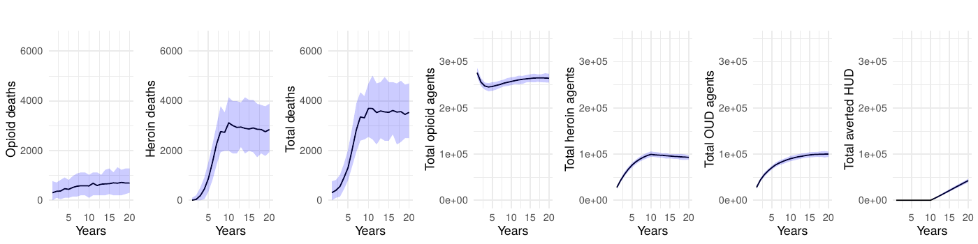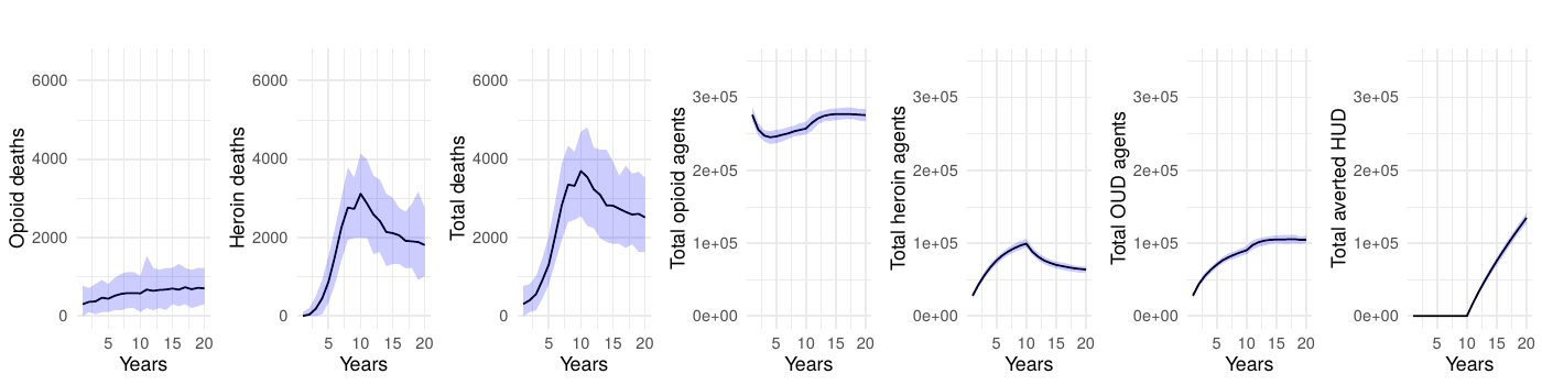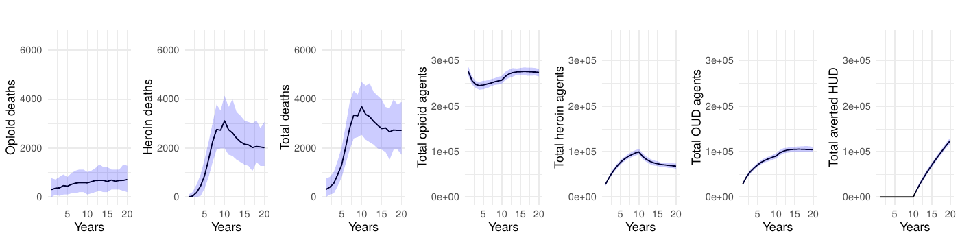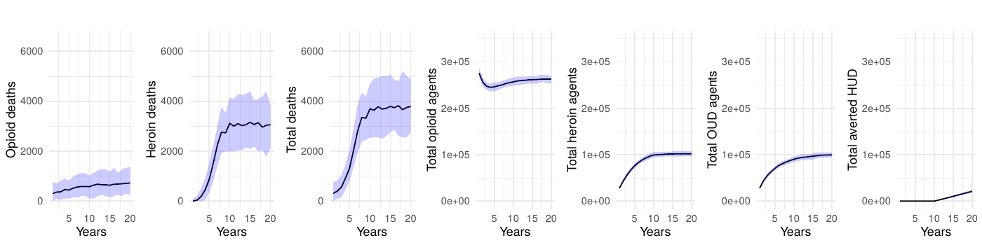 We selected 10,000 agents for our simulations to ensure sufficiently large subpopulations for analysis. We further chose to run each scenario 100 times, as pilot tests showed that this number of runs was sufficient to establish reliable 95% simulation intervals without excessively increasing computational costs. Additional experiments revealed that increasing the agent count beyond 10,000 or the number of runs beyond 100 had no appreciable effect on the overall results–opioid deaths, heroin deaths, and total deaths remained consistent–while substantially increasing the simulation runtime.