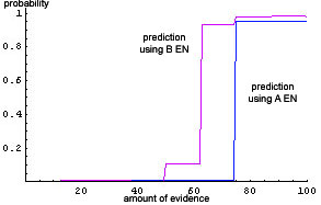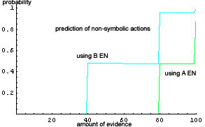 addLink(agent2,agent1,3) within this EN, the maximum expectation is taken and plotted on the y-axis. This is done both purely-empirically (green curve) and empirically-rational (cyan curve). Figure 3 thus shows the overall probability of fulfilling agent 1's request. This yields roughly the same result as above (Figure 2), but is for technical reasons much easier to compute in case the predicted sequence (the 20% at the end of the example sequence here) is very long. Figure 4 and 5 show such a case (rather extreme, for clearness), obtained from a protocol of 236 LIESON actions. Here, Figure 5 shows a good predictability, whereas Figure 4 predicts the protocol remainder only if at least 80% of the protocol is given as evidence, i.e., if the predicted sequence and the evidence overlap.