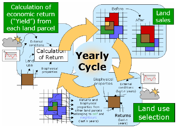 | Figure 3. The Yearly cycle in FEARLUS. Starting at the bottom right, Land Managers choose Land Uses for their Land Parcels, the Economic Return is then calculated (top left), then Land Parcel exchanged (top right) |