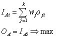 IAi designates the inference of agent A made on a specific alternative i. This inference IAi is computed in two steps. Firstly, the available opinion oji of neighbor j on alternative i is weighted with the latter neighbor's status wj. Secondly, all k neighbors' weighted opinions wjoji are summed up. Agent A chooses the inference IAi with maximal value as her preference OA.