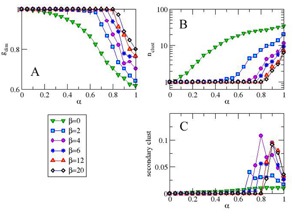 | Figure 10. Cluster statistics for different values of β as a function of the dynamical parameter α. Giant cluster dimension (A), number of clusters (B) and extremist cluster dimension (C). Results are averaged over 100 simulations |