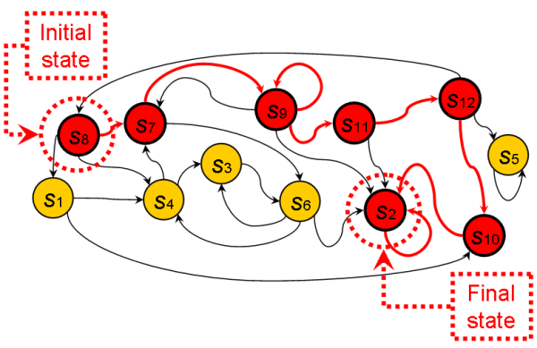 | Figure 8. Schematic transition diagram of a Markov chain. Circles denote states and directed arrows indicate possible transitions between states. In this figure, circles and arrows coloured in red represent one possible path where the initial state X0 is s8 and the final state is s2. |