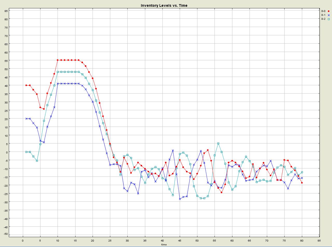 10 The simulations were run for 500 time periods ( t1 ~ t500), but the graph shows the simulation results only up to 80 time periods ( t80). Even after that time, the inventory levels repeat the same pattern, so I chose to show the results only up to that time.