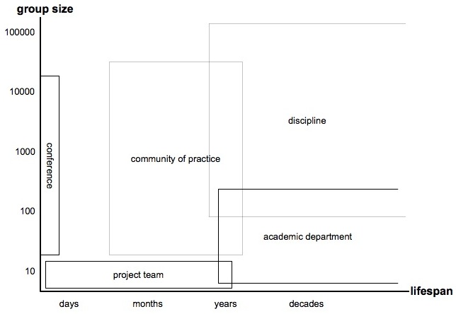Figure 1. Group size and lifespan of organizational forms in science. Conferences and meetings are tractable units as they have short, determined lifespans and a broad range of sizes.
