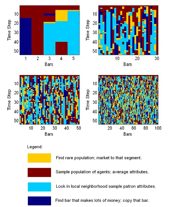 - As observed in the upper left hand corner of Figure 3, we observe that in the first few weeks of the simulation, the bars competed for the market niche (denoted by the green bars indicating an attribute change), however, as time progressed the bars eventually settled on an equilibrium. However, looking across the panels in Figure 3, we see that as the number of bars increase, the number of times they change attributes also increases. This figure lends qualitative support to our second hypothesis that states that as the number of bars increase within the community, the more bars will compete for market share. It is suggested that as the market becomes saturated, it becomes more and more difficult for businesses to compete in this environment. Therefore, equilibrium is not easily reached among the bars.