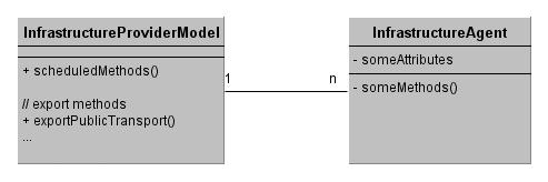 Figure A-1. The relationship of model and agent illustrated with the infrastructure provider model. In the infrastructure provider model, scheduled methods as well as methods exporting data are public and can thus be used from outside the class (indicated with '+'). Neither the infrastructure provider agent(s) nor its attributes and methods are visible (indicated with '-') For one agent type (and thus for one model), the framework consists of a default implementation, a server and an interface. The interaction of these three constructs makes sure that at least the default implementation can deliver pre-defined values in a coupled simulation if one or more models are still under development (Figure 1 in the main text). Each model extends a default implementation providing dummy values in case no concrete implementation for a specific model is available for a coupled simulation. This default implementation extends an interface that lists all the methods the model uses to export data. Servers forward the data to a coupled model. The server gets the information via the interface and either receives the data from the concrete model implementation or from the default implementation, if there is no concrete implementation available.