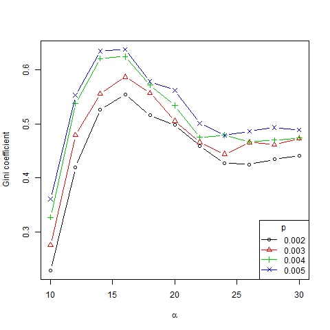 Figure 5. Gini coefficient as a function of p for β =6, N=75 and different values of α