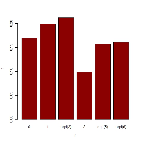 - In order to further explore the trend areas we order them according to their distance[11] from the central zone 3_3. Thus we have trend areas at distance 0, 1, sqrt(2), 2, sqrt(5) and sqrt(8). Figures 18 and 19 show the probability for a representative trend, and for the dominant trend respectively, to be located in an area at distance r. Despite representative trends being often found in extreme areas, dominant trends are significantly more likely to be located in central areas (with a probability greater than 0.85 for r ≤ sqrt(2)).