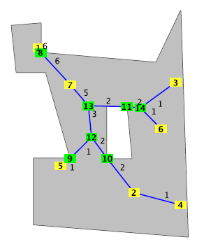- The geometric graph method uses a mathematical criterion to determine whether or not it is profitable to combine some connections partly and split them on another location. The optimal location of the splitting point is exactly determined by a geometric technique. If the network is no longer a tree, these methods can still be used but they might become more complicated when β, the cost exponent for the capacity, is large.