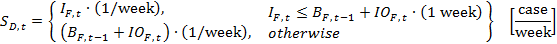 BR, t = BR, t-1 + (ENDCDt − SENDC, t) · (1 week) [case] (39) BW, t = BW, t-1 + (IOW, t − SR, t) · (1 week) [case] (40) BD, t = BD, t-1 + (IOD, t − SW, t) · (1 week) [case] (41) BF, t = BF, t-1 + (IOF, t − SD, t) · (1 week) [case] (42) IR, t = IR, t − SENDC, t · (1 week) [case] (43) IW, t = IW, t − SR, t · (1 week) [case] (44) ID, t = ID, t − SW, t · (1 week) [case] (45) IF, t = IF, t − SD, t · (1 week) [case] (46) In this study, the equality sign is used in assigning values to parameters and variables, and it does not imply a mathematical equality. Therefore, the same variable can appear on left and right sides of the same equation (see, for example, equations 43–46).
