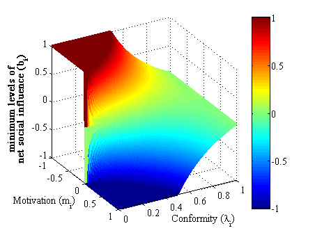 - As previously mentioned, social interactions can be homophilious in value traits that can shape the orientation of people toward future behavior. In our model, two parameters are associated with value trait, namely, motivation (mi) and conformity (λi). As suggested by McPherson et al. (2001, p. 419), value traits "often prove to be derivative of social positions themselves," so that we can obtain motivation-homo and conformity-homo networks by positively correlating the motivation and conformity of an individual to his/her status trait, respectively.