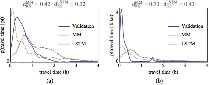 Table 9 supports this hypothesis: with an exception of walk mode, where the values of Kolmogorov-Smirnov statistic are the same, LSTM performs better than MM as expected. Figure 6 shows selected travel time PDFs so one can get an idea how the actual PDFs influence the value of the statistic.
