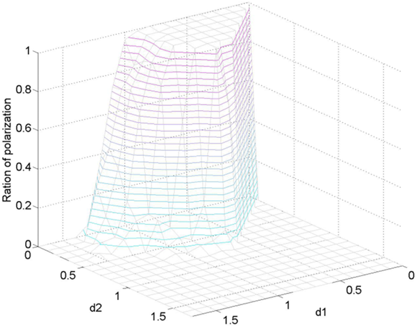 In Figure 13, we obtained similar trends with the existing results of one-dimensional opinion (Chau et al 2013). Polarization distribution of two-dimensional opinion by (\(d_1\), \(d_2\)) is shown as follows: