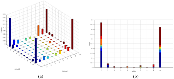 In Figure 18, the \(x\)-axis and \(y\)-axis represent the two dimensions of the opinion, and the z-axis represents the ratio of agents in each interval. Each dimension of the opinion is described by a variable in [1,10], and the colours of the columns are arbitrary for clear display, where 1 or 10 means polarized status. The left and right sub-panels correspond to different simulation times. Figure 18(a) corresponds to time=1611, and Figure 18(b) corresponds to time=1627. The opinion distribution remains unchanged from time=1611 (as shown in Figure 18(a)), and the opinion distribution suddenly shifts when time=1627 (as shown in Figure 18(b), the opinion distribution in the box changes). The phenomenon in which the opinion distribution suddenly changes over a period of time is known as the discontinuous equilibrium phenomenon. This phenomenon corresponds to the discontinuous equilibrium theory in social psychology (Schelling 1971). The discontinuous equilibrium theory shows that the people’s opinions on a social event are always inclined to change suddenly after a relatively long period of rest. This conclusion is obtained in our experiments.