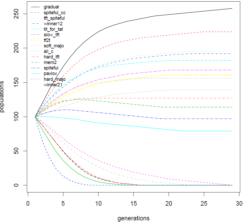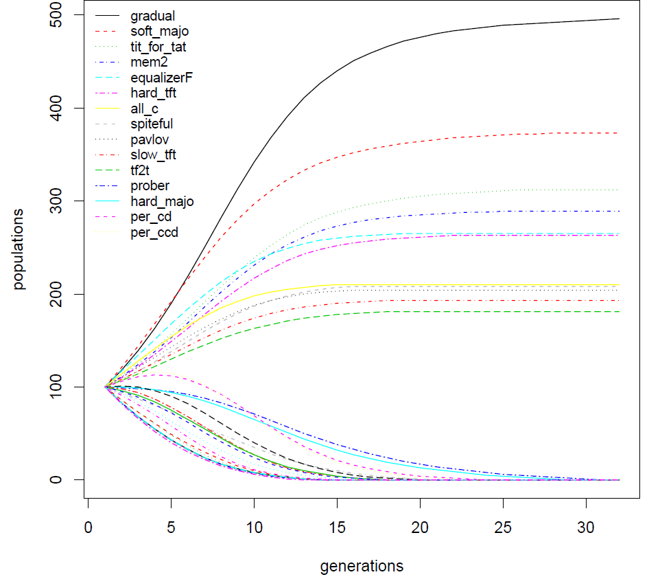 - Evolutionary competition (Axelrod 2006): take a number K of strategies of each kind in A (eg K = 100), which is what is known as Generation 1, \(\texttt{G1}\). A tournament between the strategies \(\texttt{G1}\) determines the scores of each strategy. Each strategy will have in generation 2, \(\texttt{G2}\), a number of descendants proportional to its score and only those descendants constitute generation 2, \(\texttt{G2}\). It is assumed that the total number of strategies remains constant from one generation to the next (Cardinal (G1) = Cardinal (G2) = ...). Generation 3, \(\texttt{G3}\), is calculated from the same 2nd generation etc. In an evolutionary competition, strategies that are playing poorly are quickly eliminated. Therefore, those exploiting some strategies playing poorly (which can be numerous especially in complete classes) soon stop to take benefit of them. Finally one can note that only survive the strategies playing efficiently against strategies playing efficiently too.