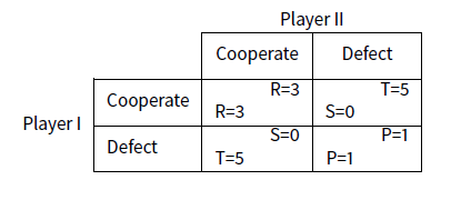 We require that \(T>R>P>S\) and \(T+S<2R\) The classical chosen values are \(\texttt{T = 5, R = 3, P = 1, S = 0}\), which gives: \(\verb|[c, c] -> 3 + 3|, \verb|[d, d] -> 1 + 1| , \verb|[d, c] -> 5 + 0|\).
