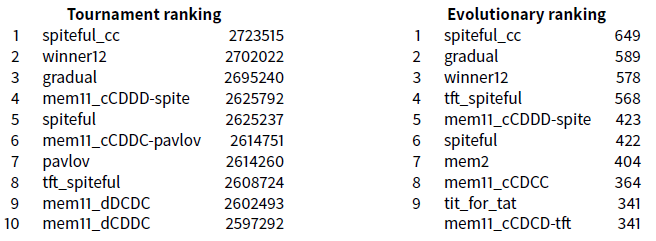We are interested in the following 10 strategies which are the best knows strategies resulting from our experiments: t_spiteful, spiteful_cc, winner12, gradual, mem2, spiteful, tit_for_tat, slow_tft, hard_tft, soft_majo.