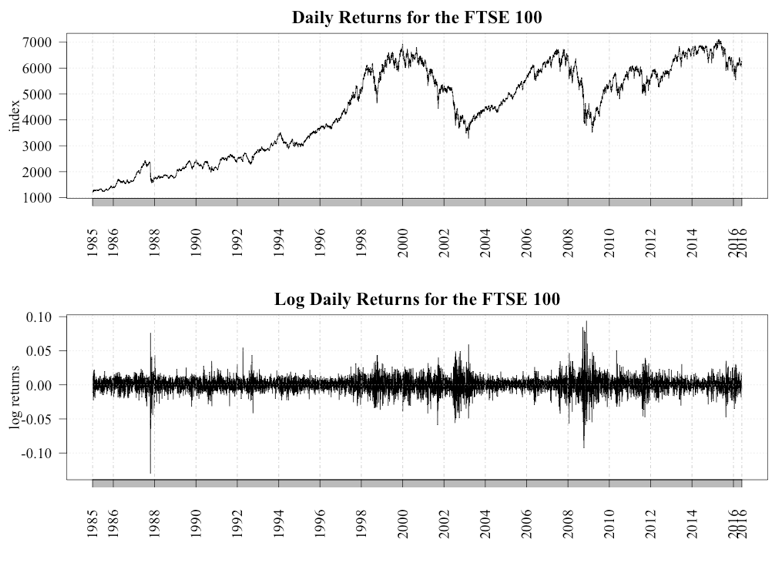 A key assumption of the EMH is that the price of an asset reflects all current and known information, and, because news arrives in a random unpredictable fashion, prices will follow a similar pattern, which is one of a random walk. This implies that returns should follow a Gaussian distribution and asset bubbles and subsequent crashes will not and cannot occur. However, a review of Figure 1, which charts the movement of the FTSE 100 index and its daily log returns between 1985 and 2016, shows that while at times the returns have followed the random walk as prescribed by the EMH, there have been several incidences where returns have deviated greatly, such as 1987 and 2007. The significance of these large deviations was seen when the global markets crashed in 2007 and the world plunged into the Global Financial Crisis (GFC), which according to the IMF cost the global economy $USD11.9 trillion (Conway 2009). Given the potential cost associated with the periods of extreme volatility, to this author a theory consistent with “close enough is good enough” does not suffice.